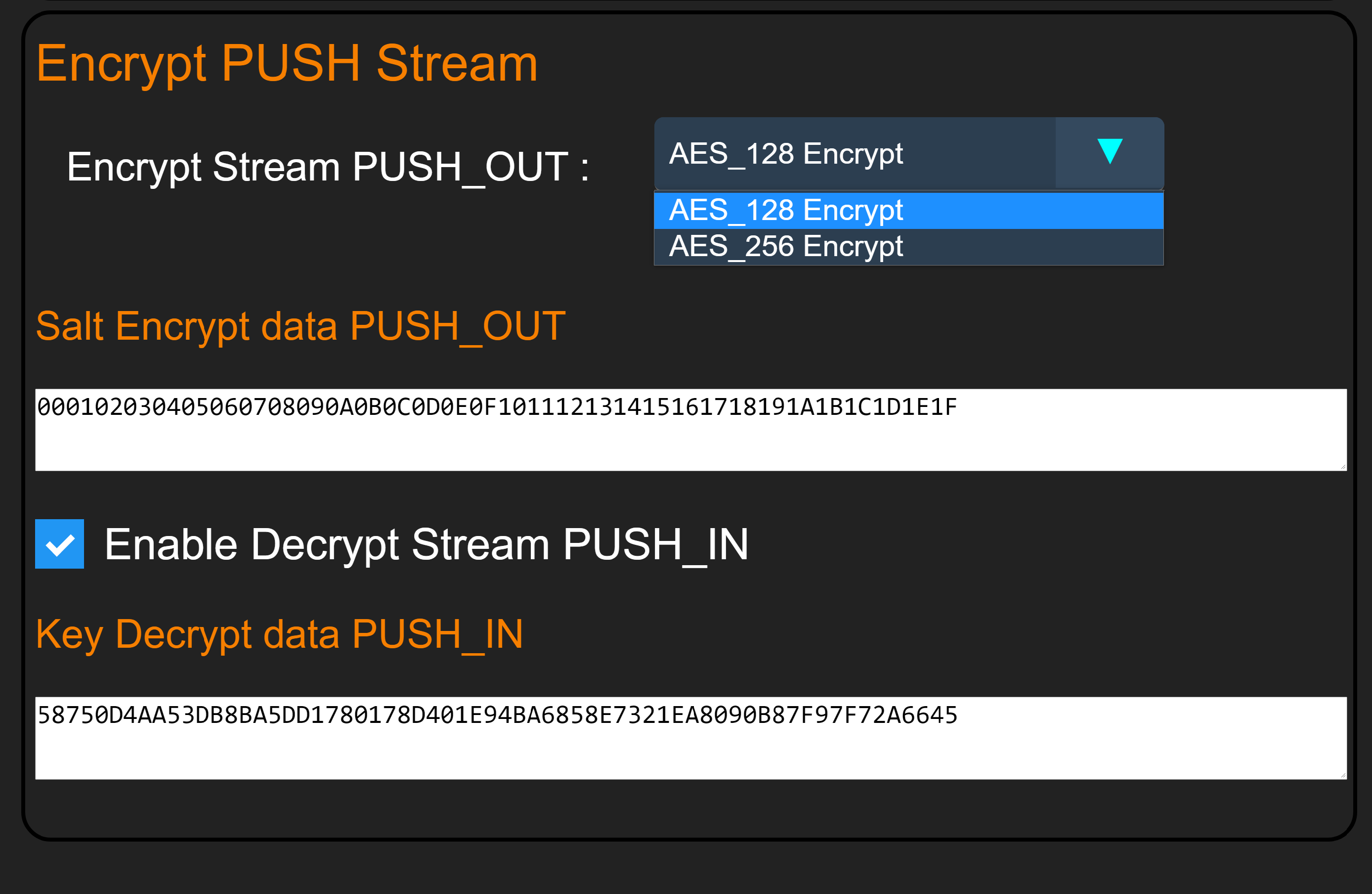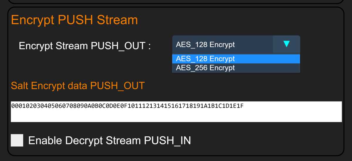 Enable this feature by enabling the “Decrypt Stream PUSH IN” flag in the UART_CONFIGURE tab. This feature requires providing a 32 Byte decryption key.