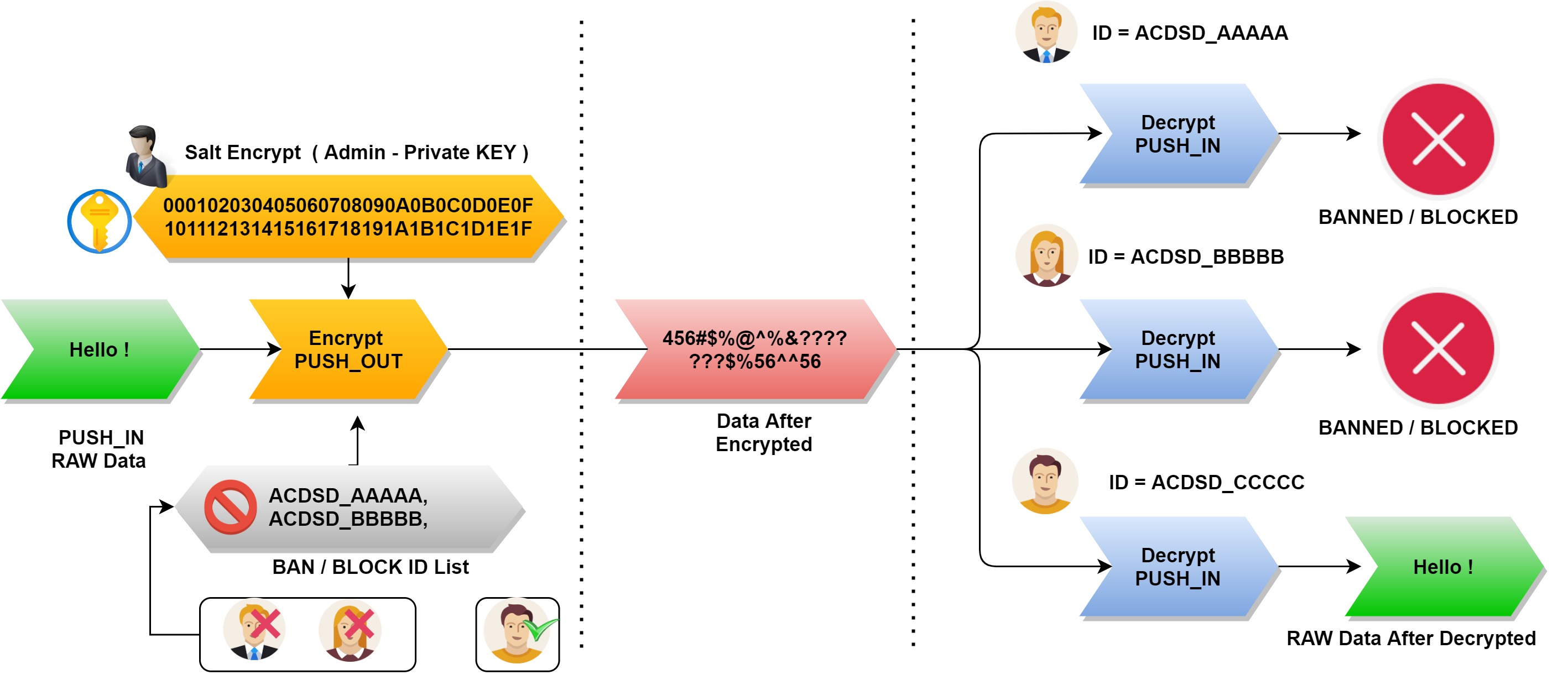 You can block any user (device) without changing the encryption and decryption keys of the entire system.