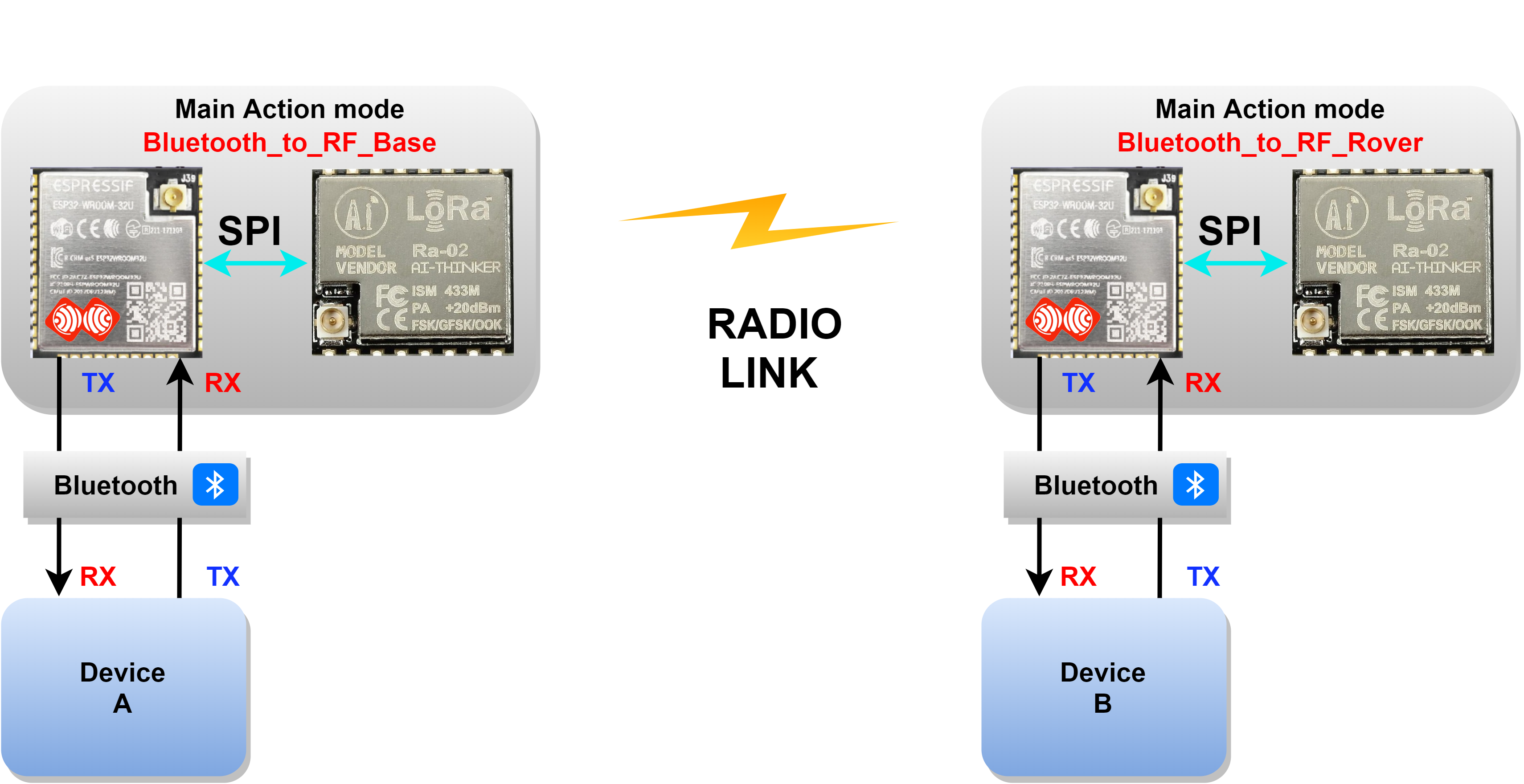– When using Bluetooth, the connection between the End Devices and ESPrtk is Bluetooth, the connection between ESPrtk Base and ESPrtk Rover will be Radio WIFI (or Radio LoRa).