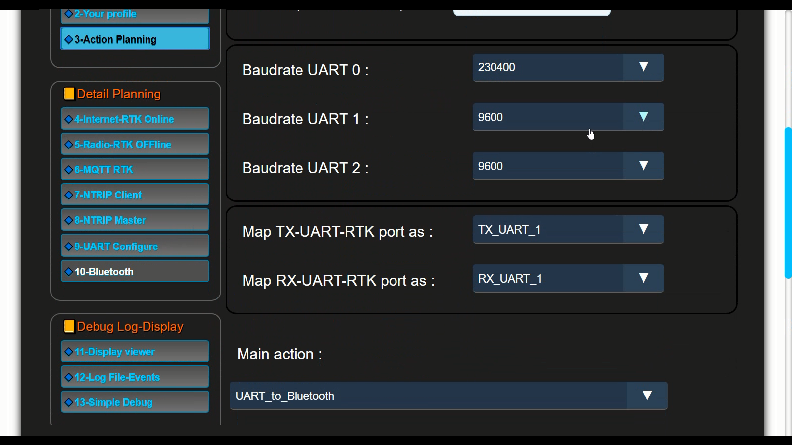 Now all data sent to ESPrtk will be exported to TX-UART-RTK port and all data received on RX-UART-RTK port will be sent back to the phone. (TX-UART-RTK and RX-UART-RTK are TX1 / TX2 and RX1 / RX2 depending on the configuration in your Action Planning above).